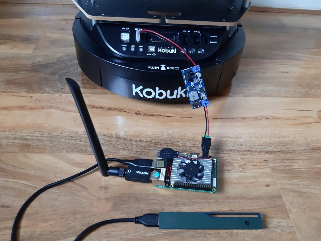 The final step is to power the robot’s single board computer (UP board) from the Turtlebot’s battery instead of a wall plug adapter. The robot base provides a 12V / 5A connection whilst the UP board power adapter output is rated at 5V / 4000mA with a 5.5 / 2.1mm jack barrel connector. Safely powering the board therefore requires a 5V power supply that is capable of supplying at least 4A of current. One way to achieve this is by connecting:
